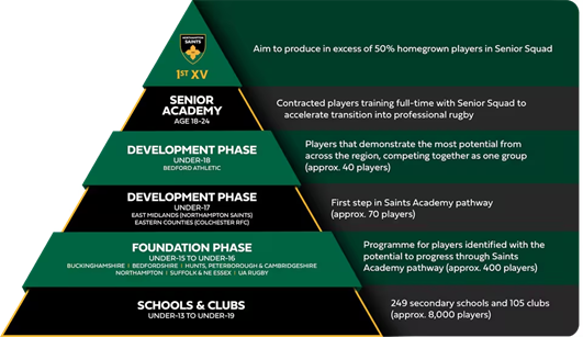 - Pathway - At this stage a few lads may transition from the Northampton Saints Foundation Phase to the Development Phase whilst more will trial and be selected to play for Bucks County as well as our own Club senior teams (see graphic below for Saints pyramid).