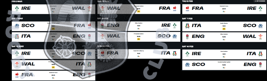 February 2026 Thursday 5th February France 20:10 Ireland Saturday 7th February Italy 14:10 Scotland England 16:40 Wales Saturday 14th February Ireland 14:10 Italy Scotland 16:40 England Sunday 15th February Wales 15:10 France Saturday 21st February England 14:10 Ireland Wales 16:40 Scotland Sunday 22nd February France 15:10 Italy |